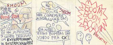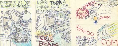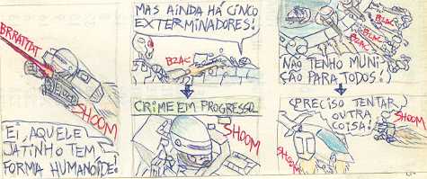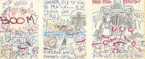... e fiquei surpreso ao perceber que gostei mais da minha própria versão, mesmo com um monte de "defeitos especiais"! Como meu traço era pouco melhor do que um rascunho, resolvi compensar colando cenas de vídeo-game, fotos dos filmes, pedaços do primeiro roteiro que eu escrevi e o que mais eu conseguisse descolar. Até que isso deu um charme de "álbum de recortes", mas o que matou mesmo foi eu ter feito a arte-final dos desenhos com caneta BIC... e em algumas partes com caneta KILOMÉTRICA! (que depois borrou tudo! Principalmente no capítulo 9!) Na época eu não conhecia nanquim... |